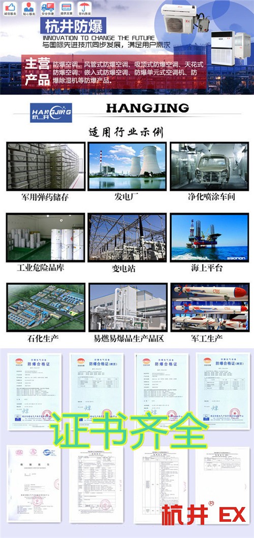 东莞防爆空调生产厂家推荐:杭井防爆现已生产的防爆空调,防爆风管机,防爆除湿机,防爆电器箱,防爆风机等150多个系列1860多个规格的产品均按GB3836-2000《爆炸性环境用防爆电气设备》标准及其它相关标准设计、制造。产品经国家的检验机关检验合格,产品畅销全国,与广大企业建立了良好的合作关系,同时产品深受全国用户好评!